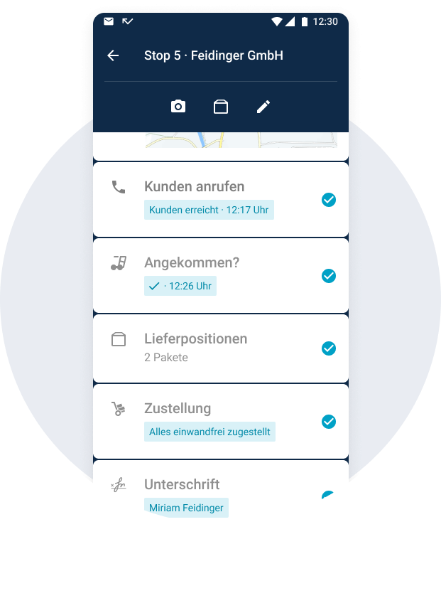 Ablieferbeleg in Echtzeit: Überall da, wo Empfänger auf der App unterschreiben, weist der Fahrer seine Leistung direkt nach. Mit Unterschrift oder Foto vom Originalbeleg. Schnell und sicher dokumentiert.